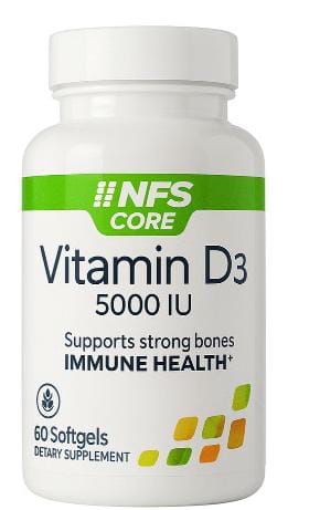 Vitamina D3 de NFS. Presenta alta potencia, es natural, sin OGM y libre de gluten Contiene 5000 UI de vitamina D3, en la misma forma biológicamente activa que produce el cuerpo al exponerse al sol.